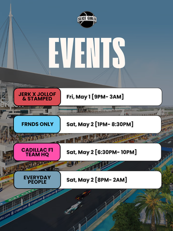 Sat, May 02Jungle PlazaCadillac is bringing F1 to the Design District and we’re outside for it. Expect bites from favorites, cocktails, cars, simulators, DJ sets, and a special appearance by Checo.
